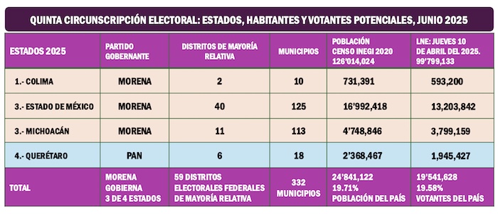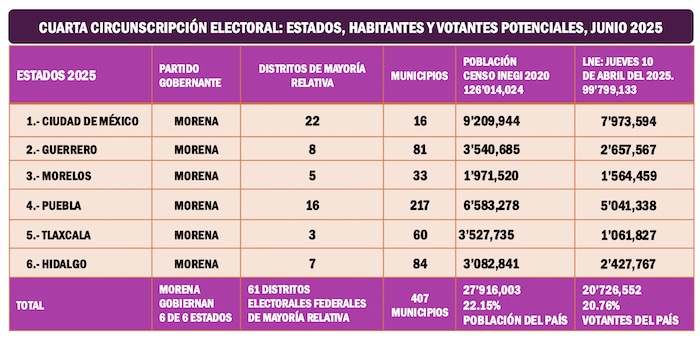 En esta Cuarta Circunscripción Electoral Morena gobierna las seis entidades que la integran: Ciudad de México, Guerrero, Morelos, Puebla, Tlaxcala e Hidalgo. Esta región sumaba la segunda votación más alta de toda la República con 2 millones 871 mil 274 ciudadanos que se hicieron presentes en las urnas el pasado domingo primero de junio del 2025. La participación de los ciudadanos en las urnas, en la Cuarta Circunscripción fue del 13.87 por ciento.
