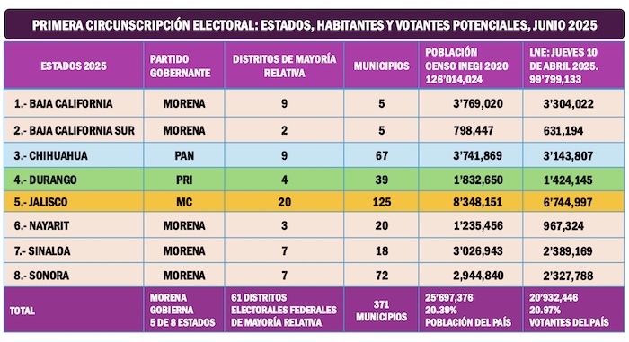 Esta región incluye el estado de Jalisco, donde gobierna Movimiento Ciudadano; Chihuahua, administrado por el PAN y Durango, que es territorio priista. Morena gobierna Baja California, Baja California Sur, Nayarit, Sinaloa y Sonora. La primera Circunscripción concentra el 20.39 por ciento de la población del país y el 20.97 por ciento de los votantes potenciales de toda la República.