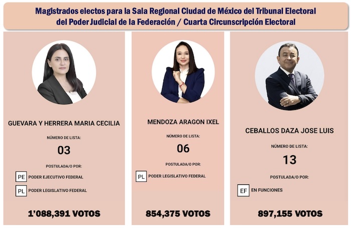 En la Sala Regional Ciudad de México del Tribual Electoral del Poder Judicial de la Federación, cabecera de la Cuarta Circunscripción Electoral, será presidenta María Cecilia Guevara y Herrera, quien llegó a la boleta postulada por el Poder Ejecutivo y por el Poder Legislativo. Ella logró la segunda votación más alta del país entre los aspirantes a magistrados de salas regionales del Tribunal Electoral, con 1 millón 88 mil 391 sufragios, cuando ya se había computado el 98.67 por ciento de las actas.