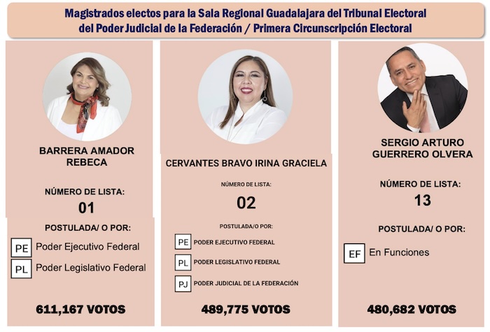 La Sala regional Guadalajara del Tribunal Electoral del Poder Judicial de la Federación será presidida por Rebeca Barrera Amador, quien llegó a la boleta postulada por el Poder Ejecutivo, depositado en la presidenta de la República Claudia Sheinbaum Pardo, y por el Poder Legislativo, que integran las cámaras de diputados y senadores. Barrera Amador tenía 611 mil 167 votos, cuando ya se había computado el 98.87 por ciento de las actas, el segundo registro más bajo para una presidente de sala regional, lo que es explicable porque fue en esta Primera Circunscripción donde se registró la más baja votación de todo el país con 2 millones 117 mil personas que acudieron a las urnas, apenas el 10.14 por ciento de los sufragantes potenciales.