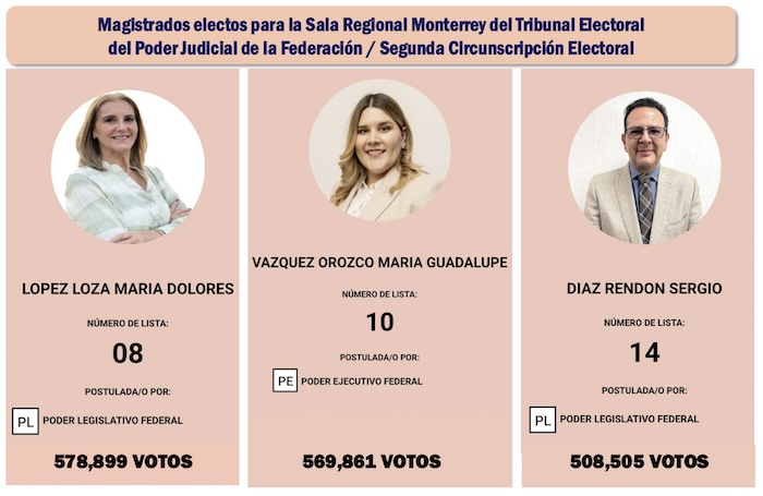 Con el 98.87 por ciento de las actas computadas, ya estaba claro que quien presidirá la Sala Regional Monterrey, que corresponde a la Segunda Circunscripción Electoral del país será María Dolores López Loza, quien llegó a la boleta postulada por el Poder Legislativo y sumaba 578 mil 899 sufragios, el registro más bajo entre las cinco regiones en las que está divido el país.