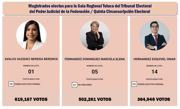La Sala Regional Toluca es la cabecera de la Quinta Circunscripción Electoral, donde será presidenta de ese tribunal Nereida Berenice Ávalos Vázquez, quien con el 98.67 por ciento de los votos computados ya era la triunfadora indiscutible, al sumar 619 mil 167 votos en su favor. En esta región acudieron a votar 2 millones 304 mil 510 personas, el 11.83 por ciento de la Lista Nominal de la región.