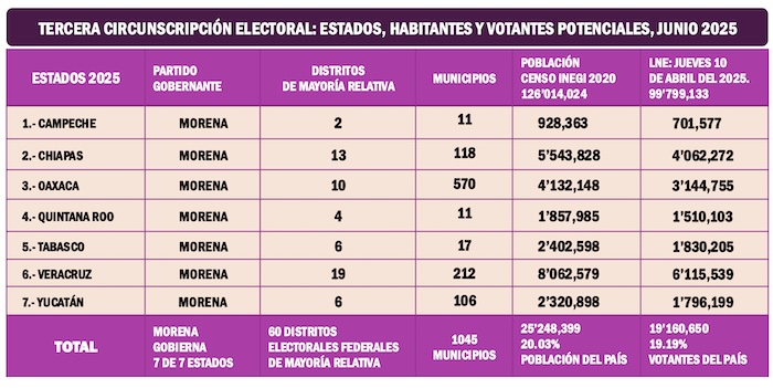 En esta región los siete estados que la integran están gobernados por Morena y sumaron un total de 2 millones 980 mil 88 sufragios. Este es el granero de votos de Morena por incluye los estados de Campeche, Chiapas, Oaxaca, Quintana Roo, Tabasco, Veracruz y Yucatán. En la Tercera Circunscripción acudió a las urnas el 15.96 por ciento de los votantes potenciales, el más alto porcentaje en toda la República, en los comicios para magistrados electorales.