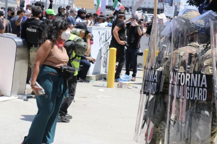 Los Ángeles, 9 de junio (LaOpinión).- “Renuncien a su trabajo!”, “¡Son una vergüenza!”, “¡Váyanse a casa!”, “¡No sigan las órdenes de lastimar a su propia gente!”, gritaron cientos de manifestantes en contra de elementos de la Guardia Nacional (GN) de California que resguardaban el edificio Edward R. Roybal y que fueron enviados por el Presidente Donald Trump, en sus intentos por silenciar a quienes se oponen a las políticas de deportación y el asedio de agentes del Servicio de Inmigración y Control de Aduanas (ICE) en el sur de California.