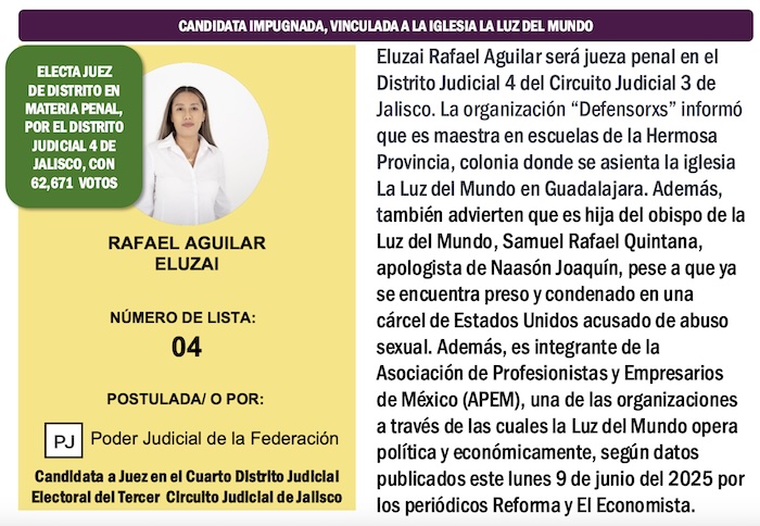 Eluzai Rafael Aguilar será jueza penal en el Distrito Judicial 4 del Circuito Judicial 3 de Jalisco. La organización “Defensorxs” informó que es maestra en escuelas de la Hermosa Provincia, colonia donde se asienta la iglesia La Luz del Mundo en Guadalajara. Además, también advierten que es hija del obispo de la Luz del Mundo, Samuel Rafael Quintana, apologista de Naasón Joaquín, pese a que ya se encuentra preso y condenado en una cárcel de Estados Unidos acusado de abuso sexual. Además, es integrante de la Asociación de Profesionistas y Empresarios de México (APEM), una de las organizaciones a través de las cuales la Luz del Mundo opera política y económicamente, según datos publicados este lunes 9 de junio del 2025 por los periódicos Reforma y El Economista.