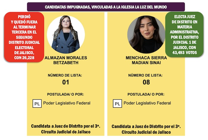 Sin embargo, el INE sí tendrá que revisar nuevamente los expedientes de dos candidatas que ganaron sus respectivas contiendas para ser juezas de distrito en el estado de Jalisco, pues están impugnadas porque se les considera inelegibles al no tener buena fama pública, pues se les vincula estrechamente con la iglesia La Luz del Mundo, cuyo líder religioso está preso en Estados Unidos, confeso de haber cometido abusos sexuales. Además la presencia en las boletas de candidatos vinculados a La Luz del Mundo, podría haber violado el Estado Laico, que separa los asuntos de gobierno de los asuntos religiosos, como establecen el Artículo 130 constitucional y la Ley de Asociaciones Religiosas y Culto Público.
