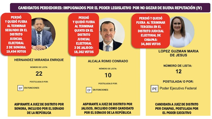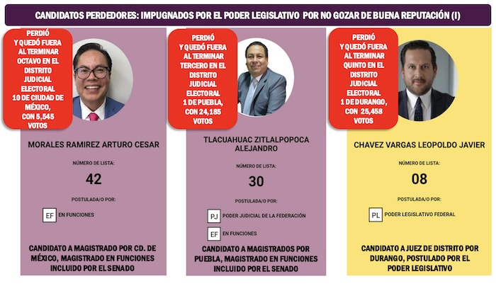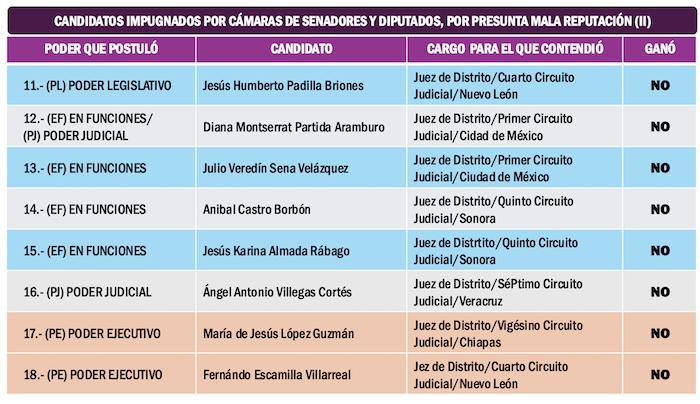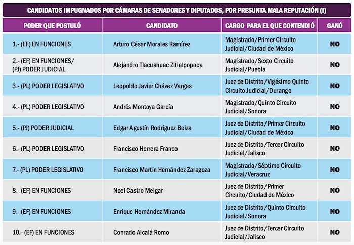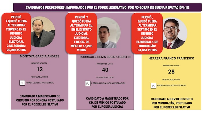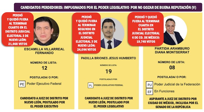 Ciudad de México, 9 de junio (SinEmbargo).- Finalmente el Instituto Nacional Electoral no tendrá que preocuparse por revisar nuevamente los perfiles de los 18 candidatos que fueron impugnados por el Poder Legislativo, al considerar que no cumplían los requisitos para estar en la boleta, pues ninguno de ellos ganó sus respectivas votaciones en diferentes circuitos judiciales del país. El pasado domingo 4 de mayo del 2025, el Poder Legislativo de la federación informó que los presidentes de la Cámara de Diputados, Sergio Gutiérrez Luna, y del Senado de la República, José Gerardo Rodolfo Fernández Noroña, solicitaron formalmente al Instituto Nacional Electoral (INE) la cancelación del registro de candidaturas que estarían en las boletas de la elección para renovar el Poder Judicial de la Federación el pasado domingo primero de junio del 2025, porque no cumplían el requisito constitucional de gozar de buena reputación.