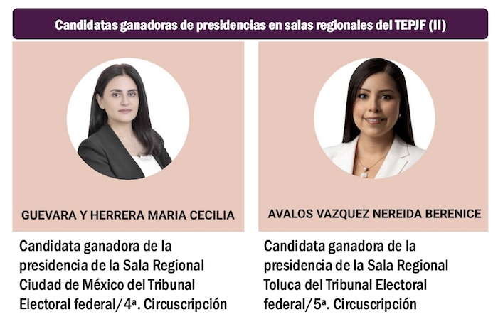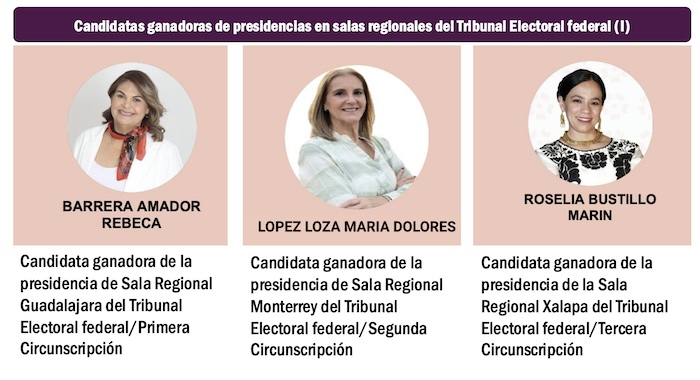 En tanto que al frente de las salas regionales habrá sólo mujeres en las respectivas presidencias: Rebeca Barrera Amador presidirá la Sala Regional Guadalajara, correspondiente a la Primera Circunscripción Electoral; la Sala Regional Monterrey, correspondiente a la Segunda Circunscripción Electoral será presidida por María Dolores López Loza.