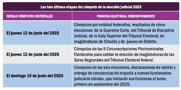 A partir del jueves 12 de junio del 2025 darán inicio los cómputos por entidad federativa en los 32 Consejos Locales del INE, de cinco de las seis elecciones: ministras y ministros de la Suprema Corte; magistraturas del Tribunal de Disciplina Judicial; magistraturas de Sala Superior del Tribunal Electoral del Poder Judicial de la Federación; magistraturas de Circuito, así como jueces de Distrito.