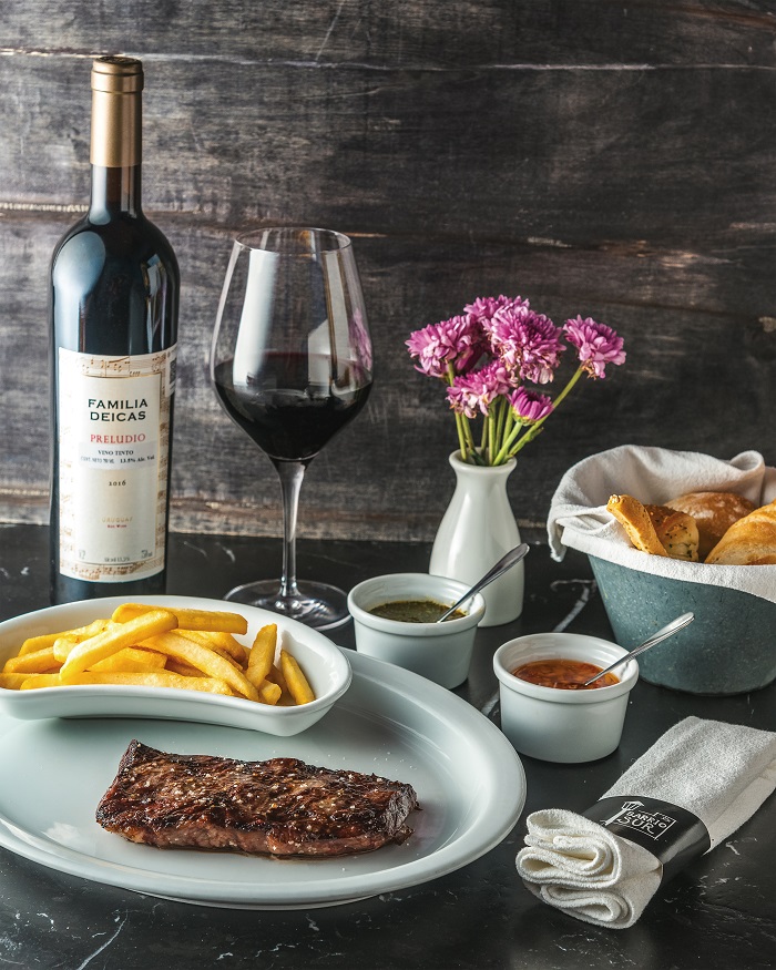El menú tiene opciones variadas, además de disfrutar de un buen corte de carne, también podrás degustar gnocchis gorgonzola, ravioles al pomodoro, tallarines, ensaladas, sopas e incluso algunas opciones marinas como pulpo o salmón. Podrán maridar sus alimentos con gran variedad de vinos uruguayos, tintos como el Don Pascual Tannat o si prefieres vino blanco un Don Pascual Chardonnay, o disfrutar de un vino de alta crianza como Preludio de Familia Deicas entre otros importados exprofeso para el restaurante y que sólo encontrarán aquí.