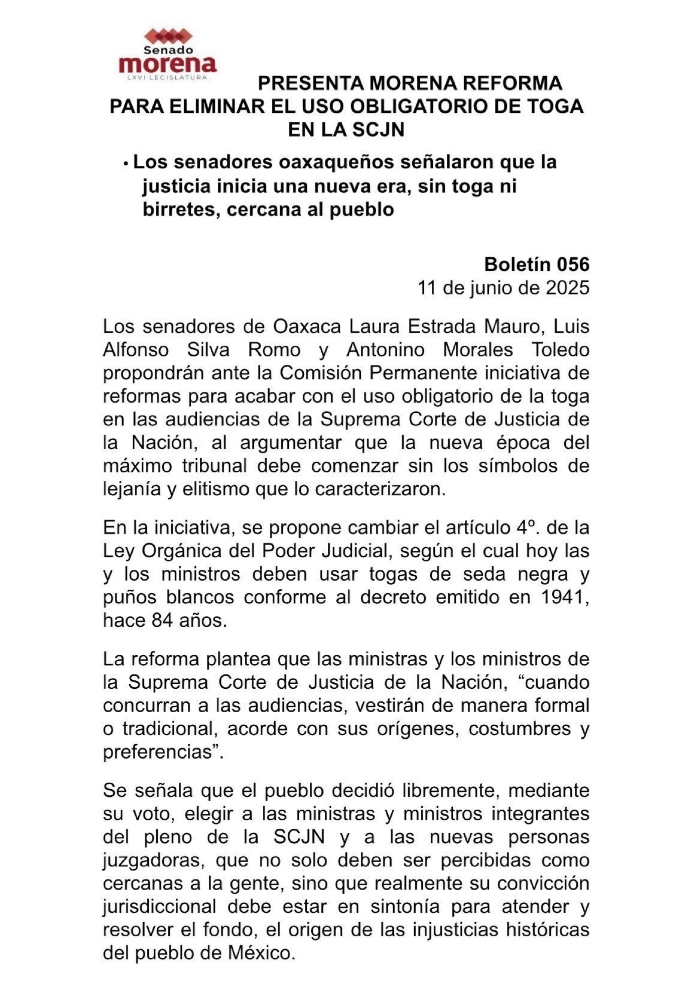 La bancada de Morena busca reformar la Ley Orgánica del Poder Judicial para permitir que las y los ministros de la SCJN puedan prescindir de la toga y optar por una vestimenta acorde a sus tradiciones.