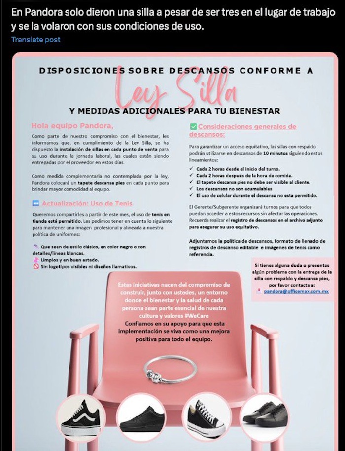 Asimismo, en una tienda Pandora solo otorgaron una silla cuando son tres empleados y les prohibieron usar su celular durante esos diez minutos de descanso cada dos horas.