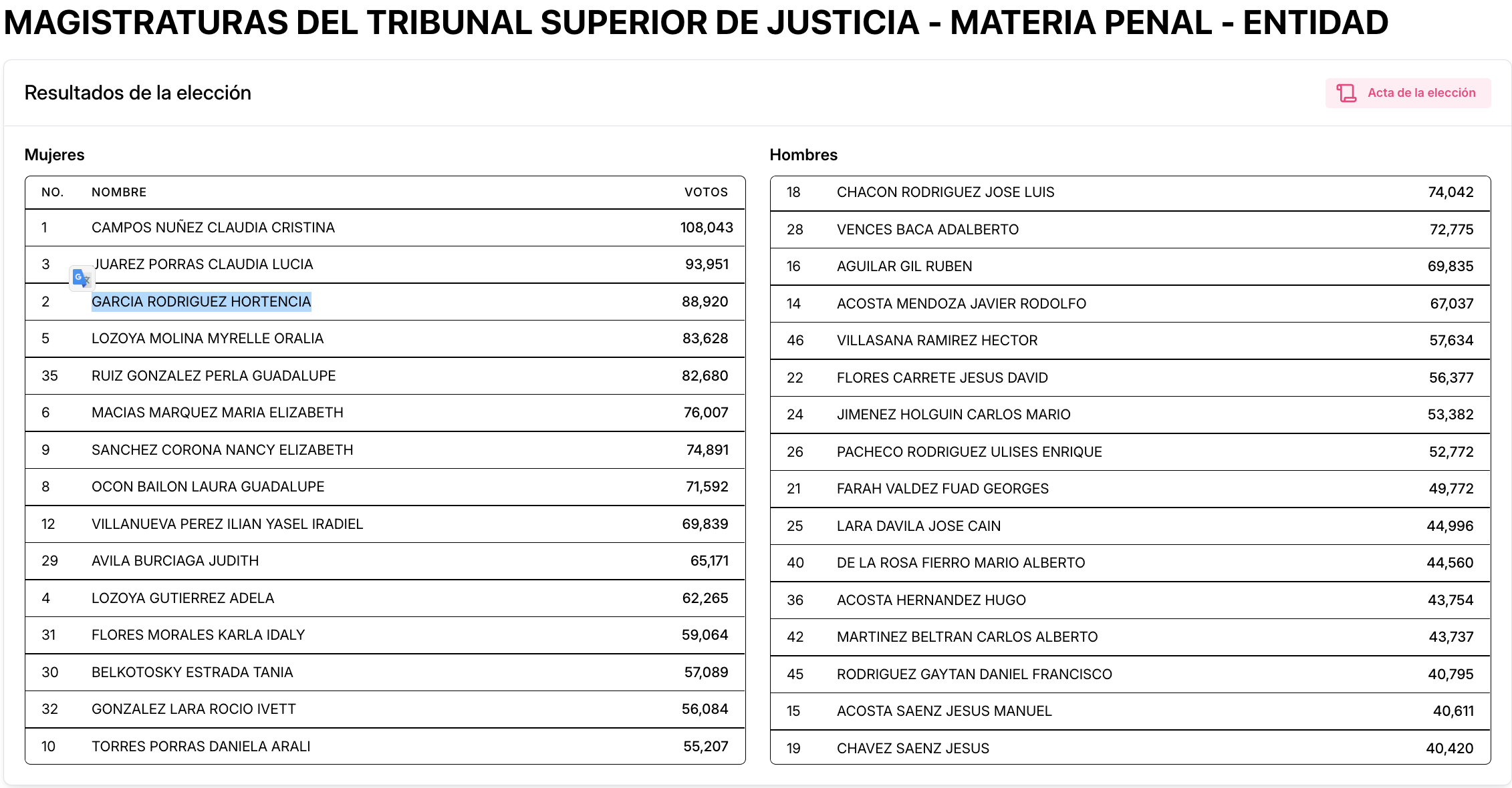 García Rodríguez obtuvo en total 88 mil 920 votos, quedando en tercer lugar. Ya con el 100 por ciento de las actas computadas para los integrantes al Tribunal Superior de Justicia de Chihuahua, quienes lideran los cómputos preliminares, en el área penal fueron las mujeres con mayor votación son Claudia Cristina Campos Núñez, Claudia Lucía Juárez Porra, Hortencia García Rodríguez y Myrelle Oralia Loyoza. Entre los hombres figuran Gerardo Javier Acosta Barrera, José Luis Chacón Rodríguez, Adalberto Vences Baca y Rubén Aguilar Gil.