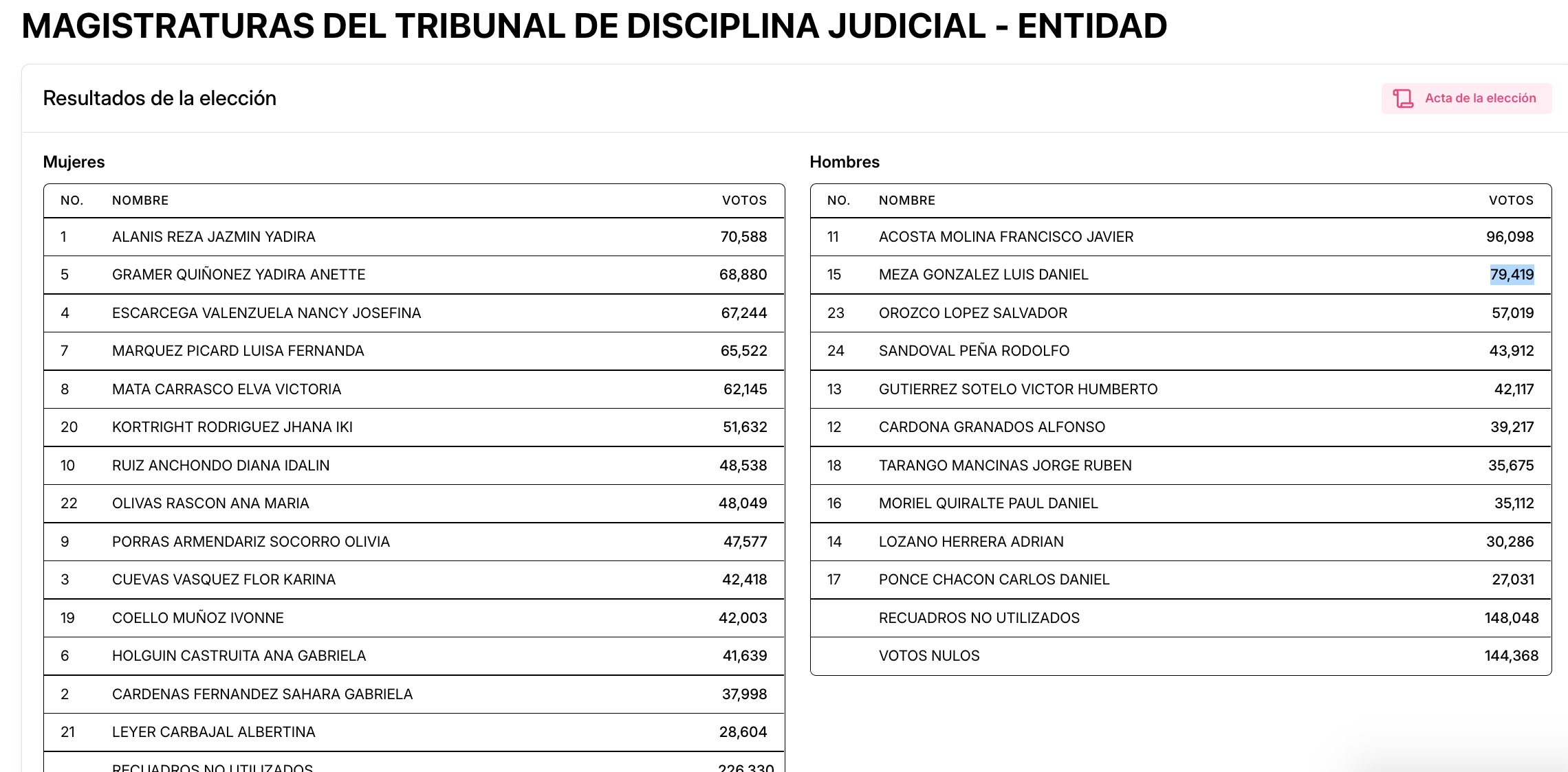 En cuanto al Tribunal de Disciplina, quienes pudieran llegar, además de la jueza que promovió la controversia contra los libros de texto gratuito, quien encabezó el cómputo es Francisco Javier Acosta Molina con un total 96 mil 98 votos. Él fue cargo de la Consejería Jurídica del Gobierno del Estado de Chihuahua, desde el año 2021, es decir, en el sexenio de María Eugenia Campos, el segundo candidato con el mayor número de votos, es Luis Daniel Meza González con 79 mil 419. De acuerdo con medios locales, ambos candidatos, aparecían en los acordeones y listados que promovía el Partido Acción Nacional.