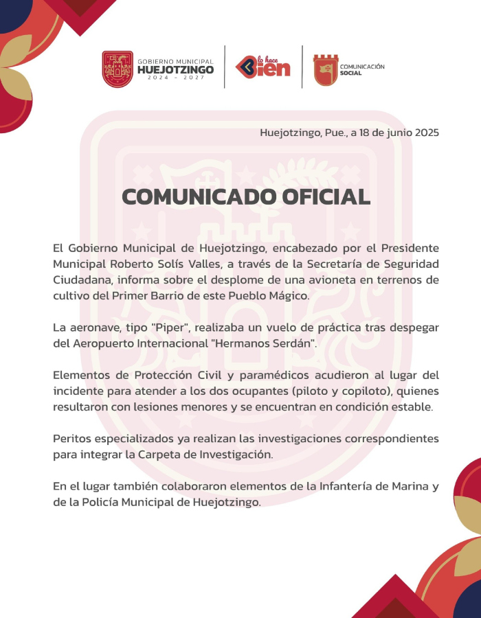 "Elementos de Protección Civil y paramédicos acudieron al lugar del incidente para atender a los dos ocupantes [piloto y copiloto], quienes resultaron con lesiones menores y se encuentran en condición estable", detalló el Ayuntamiento de Huejotzingo.