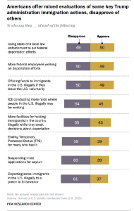 Uno de los datos claves es que, incluso antes de que se llevaran a cabo las redadas masivas en Los Ángeles, el 54 por ciento desaprueba el aumento de estos operativos del Servicio de Inmigración y Control de Aduanas (ICE, por sus siglas en inglés) en lugares de trabajo donde podrían trabajar personas que se encuentran en EU sin papeles. Pero el 45 por ciento está a favor.
