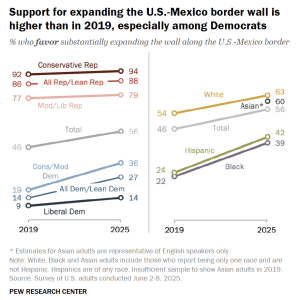 Incluso entre los demócratas, el apoyo al muro creció casi al doble en estos seis años: pasó de un 14 por ciento de aprobación a un 27 por ciento en 2025.