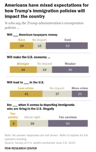 Una ceñida mayoría de estadounidenses aún ven con malos ojos las redadas masivas contra los migrantes, y las políticas más radicales de Trump, pero también está a favor del muro fronterizo con México y ha endurecido su postura con respecto a aquellos que llegan al país sin papeles.