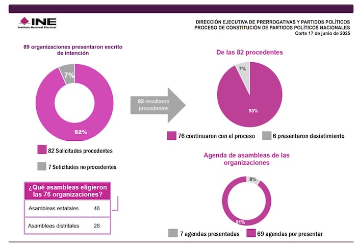 Hasta el corte del pasado miércoles 18 de junio del 2025, la organización denominada Personas Sumando Personas, que pretende constituir el partido político Somos México, sólo había realizado 38 asambleas distritales de las 200 que debe llevar a cabo. En tanto que la organización Construyendo Sociedades de Paz, que promueve un partido político con ese mismo nombre, sumaba 51 asambleas distritales, cuando cuando faltarían sólo 34 fines de semana hasta la fecha de la solicitud de registro en febrero del 2026. Por lo tanto, cuando mucho habría margen para que las dos organizaciones señaladas realizarán un máximo de 68 asambleas distritales, si llevaran a cabo por lo menos una, cada uno de los sábados y domingo previos a la realización de su Asamblea Nacional Constitutiva, que deberá llevarse a cabo a más tardar el 25 de febrero del 2026.