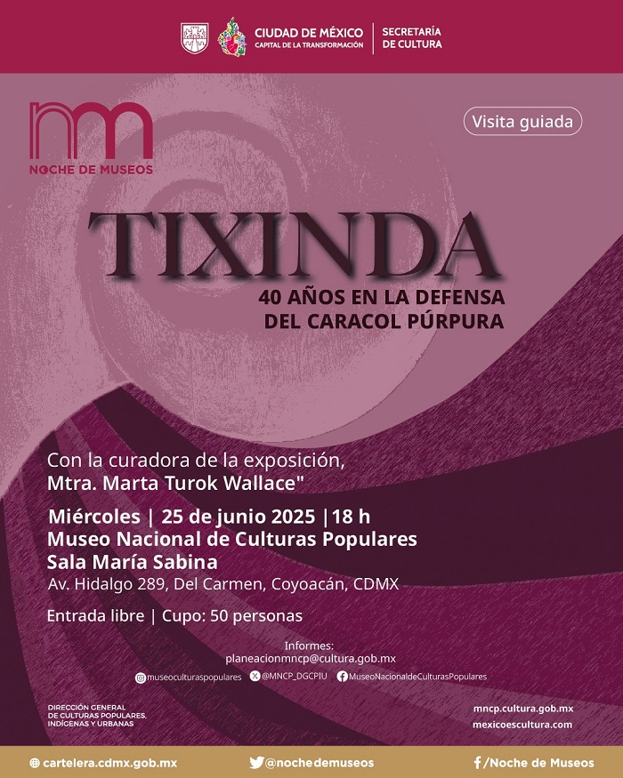 En el Museo Nacional de Culturas Populares se realizará una visita guiada por la exposición "Tixinda. 400 años en la defensa del caracol púrpura" con la curadora la Mtra. Marta Turok Wallace.