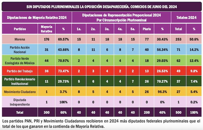 Hay una verdad irrefutable que desarma las argumentaciones de la oposición con respecto al respaldo popular que legitima la supremacía de Morena en el Poder Legislativo y del valor y las urgencias que para esas minorías representan los plurinominales: Si sólo hubiera senadores y diputados de Mayoría Relativa en el Congreso de la Unión, la presencia de Morena y sus aliados sería aplastante. Veamos dos ejemplos: en los comicios del pasado junio, Morena y sus aliados ganaron 60 de 64 senadurías de Mayoría Relativa, en 30 estados del país, para un porcentaje del 93.75 por ciento. De la misma manera, Morena y sus aliados ganaron 256 de 300 diputados de Mayoría Relativa en 30 de 31 estados del país, para un porcentaje del 85.33 por ciento.