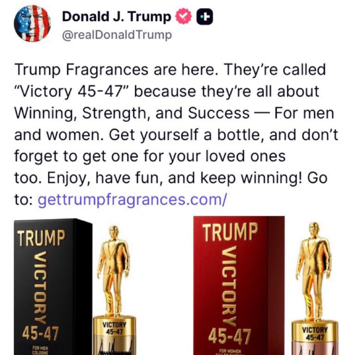 “Las fragancias Trump ya están aquí. Se llaman ‘Victory 45-47’ porque se centran en la victoria, la fuerza y el éxito, tanto para hombres como para mujeres”, escribió.