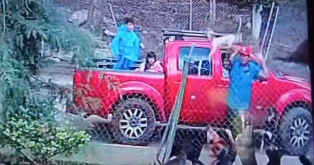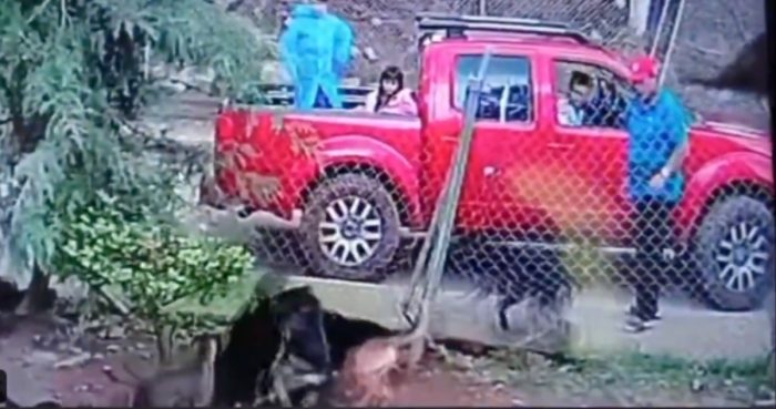 Las sensibles imágenes muestran cómo una camioneta Nissan Frontier roja se detiene frente al refugio, de la cual desciende un hombre -acompañado de dos menores y una mujer- mientras sujeta al perro, al cual procede a lanzar sin precaución alguna al interior del predio.