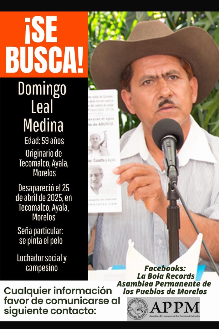 Domingo Leal Medina, conocido defensor del territorio en Morelos, fue visto por última vez el 25 de abril en Tecomalco, Ayala, aunque la Comisión Estatal oficializó la búsqueda apenas el pasado 3 de julio. Su desaparición ha generado movilizaciones pues desde 2012 es parte de la resistencia al Proyecto Integral Morelos.