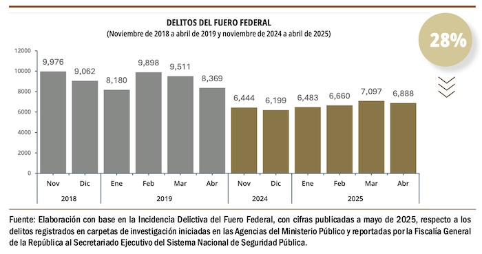 Los delitos del fuero federal disminuyeron 28 por ciento al comparar los periodos de noviembre de 2018 a abril de 2019 y de noviembre de 2024 a abril de 2025. Los delitos contra la salud, posesión ilegal de armas, delitos electorales, delitos cometidos por personas servidoras públicas y delitos en materia de hidrocarburos presentaron picos altos durante el primer bloque de tiempo con resultados de 9 mil 976 casos en noviembre de 2018 y 9 mil 898 en febrero de 2019. En contraste, los datos del segundo periodo revelan una reducción sostenida con registros por debajo de los 7 mil 100 casos mensuales.