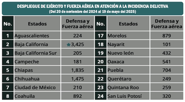 La Secretaría de la Defensa Nacional y la Secretaría de Marina desplegaron 33 mil 787 elementos, 29 mil 711 militares y 4 mil 76 navales para efectuar operativos orientados a identificar y detener a generadores de violencia, desmantelar estructuras criminales, vigilar el espacio terrestre, marítimo y aéreo, proteger instalaciones estratégicas, entre otras acciones prioritarias. Estas labores se encaminaron a mantener el orden público y prevenir delitos de alto impacto, con respeto de los derechos humanos, y apego a los principios constitucionales y a los ejes establecidos en la Estrategia Nacional de Seguridad Pública.