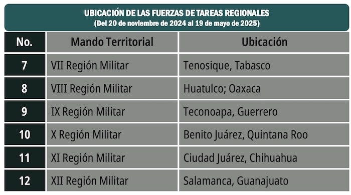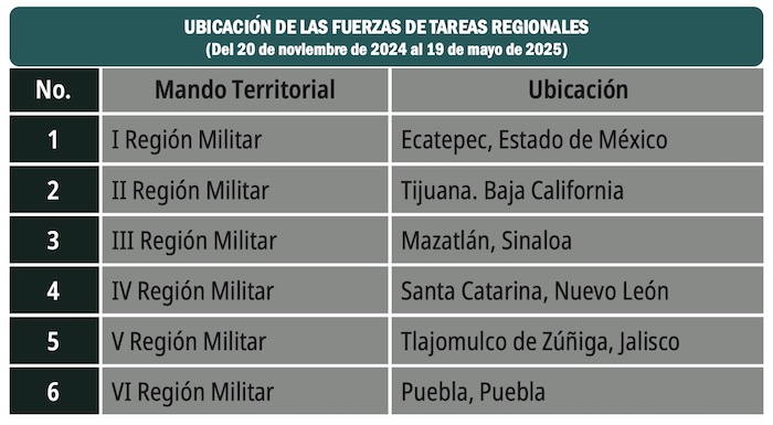 Como parte del modelo de despliegue flexible orientado a responder con oportunidad ante problemáticas específicas de seguridad, las Fuerzas de Tareas Regionales fueron conformadas por 3 mil 600 efectivos distribuidos en las 12 Regiones Militares del país a fin de colaborar en actividades de apoyo a la seguridad pública.
