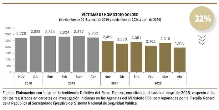 Las víctimas de homicidio doloso disminuyeron 32 por cidnto en abril de 2024 respecto a diciembre de 2018, mes con el máximo histórico registrado en los periodos analizados (noviembre 2018 - abril 2019 y noviembre 2024 - abril 2025) al pasar de 2 mil 893 víctimas a mil 958. La reducción promedio en el comparativo de ambos bloques es del 20 por ciento.