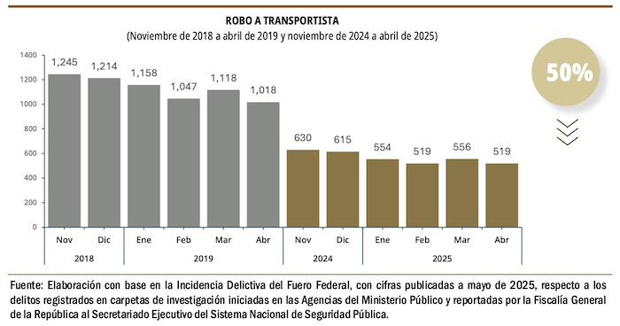 De noviembre de 2024 a abril de 2025 el robo a transportista disminuyó 50 por ciento, en comparación con el periodo de noviembre de 2018 a abril de 2019. Durante los meses analizados de los años 2018 a 2019 el promedio mensual superó los mil 100 casos, mientras que en los mismos meses del segundo periodo la cifra máxima fue de 630 casos.