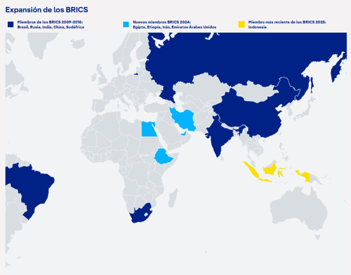 Con la reciente adhesión de Egipto, Etiopía, Irán, Emiratos Árabes Unidos e Indonesia y casi una docena de nuevas naciones socias como Argelia y Malasia, los BRICS se encuentran claramente en una senda de rápido crecimiento.