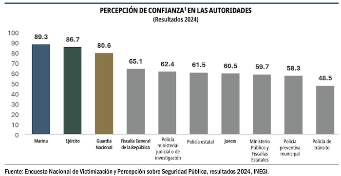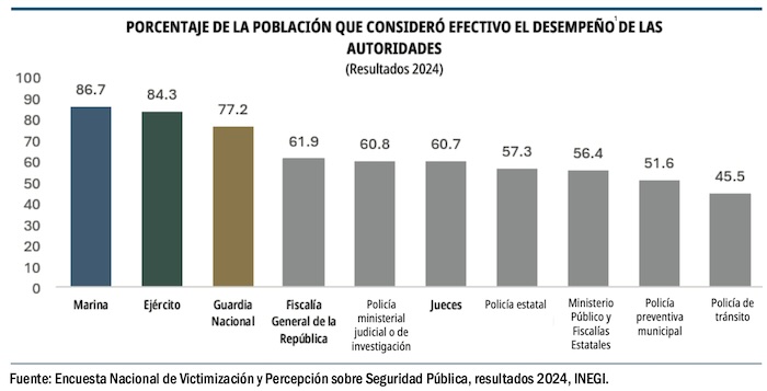 En el primer trimestre de 2025 la percepción sobre el desempeño de la Secretaría de Marina alcanzó su porcentaje más alto al comparar dicho indicador en cada trimestre desde septiembre de 2018 hasta marzo de 2025; el 89.7 por ciento de la población de 18 años y más consideró efectivo el desempeño de los elementos navales de enero a marzo de 2025; en el mismo periodo el Ejército Mexicano alcanzó la confianza del 86.7 por ciento de la población de acuerdo con la Encuesta Nacional de Seguridad Pública Urbana.