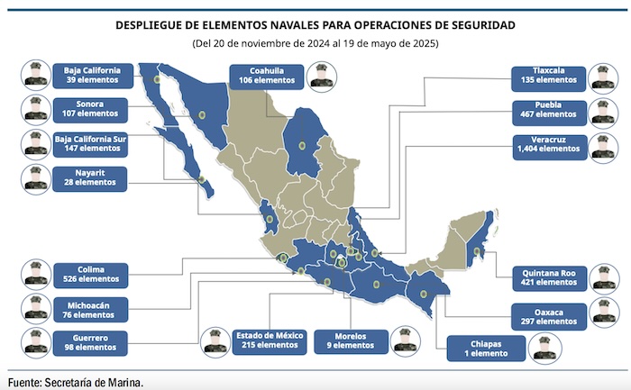 Refiere el primer informe que la Fuerza Armada Permanente, en apoyo de las tareas de seguridad pública que la Marina Armada de México desplegó 4 mil 76 elementos en 16 estados (11 costeros y cinco no costeros) en cumplimiento de sus responsabilidades de brindar apoyo a las tareas de seguridad pública y protección estratégica: 3 mil 168 de estos efectivos fueron asignados de manera directa a operaciones de seguridad pública, mientras que 908 elementos se destinaron como fuerza de refuerzo estratégico; esto permitió ampliar la capacidad de reacción ante escenarios de alto riesgo o emergencias focalizadas.