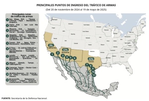 Ciudad de México, 10 de julio (SinEmbargo).- Son 11 los principales puntos fronterizos de tráfico de armas a México, procedentes de los estados de California, Arizona y Texas, se concluye en el primer informe que la Fuerza Armada Permanente, en apoyo de las tareas de seguridad pública, presentó el pasado jueves 3 de julio del 2025 al Senado de la República, que comprende las operaciones realizadas por el Ejército, la Fuerza Aérea, la Marina Armada de México y la Guardia Nacional, en el periodo del 20 de noviembre de 2024 al 19 de mayo de 2025.