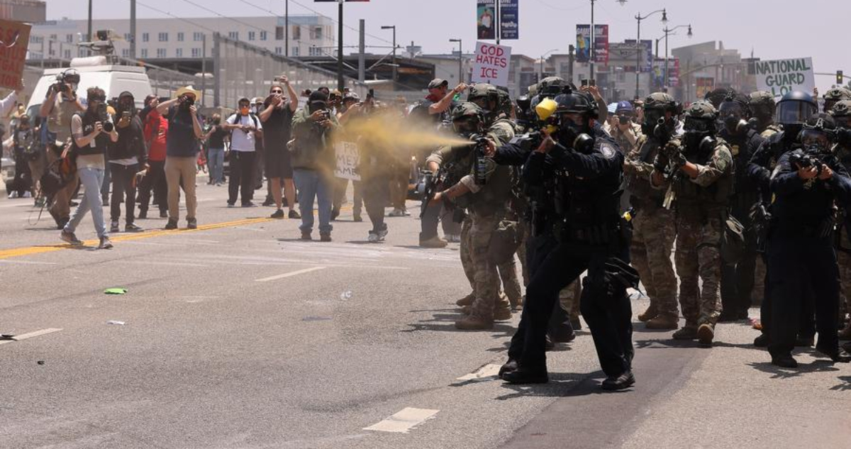 Oficiales de policía intentan dispersar a manifestantes frente al Centro de Detención Federal de Los Ángeles, California, el 8 de junio. Foto: Qiu Chen, Xinhua