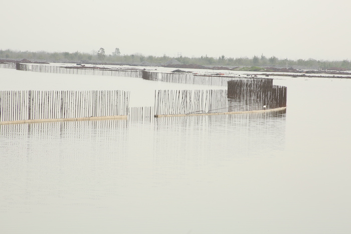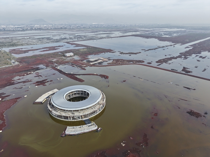 La terminal en forma de “X” y otras zonas de lo que sería el Nuevo Aeropuerto Internacional de Texcoco está parcialmente cubierta después de días de lluvias intensas. Para integrantes del Frente de Pueblos en Defensa de la Tierra esto es una muestra de que el Lago de Texcoco y sus pueblos continúan borrando el rastro del fallido aeropuerto.