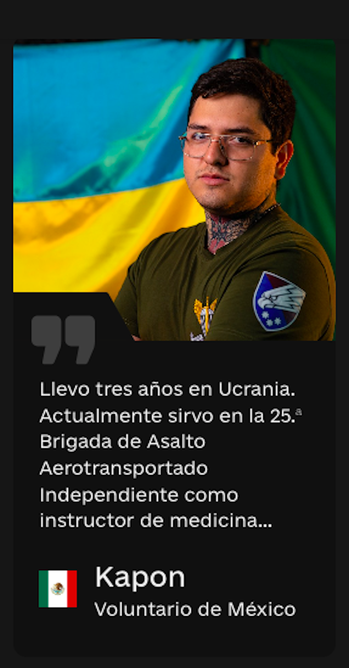 En la página se comparten también distintos testimonios de combatientes peruanos, colombianos, brasileños, argentinos e incluso de México, como es el caso de un joven identificado como Enrique o Kapon. "Llevo tres años en Ucrania. Actualmente sirvo en la 25.ª Brigada de Asalto Aerotransportado Independiente como instructor de medicina táctica, y anteriormente fui operador de drones FPV y operador de sistemas antitanque", dice el mexicano.