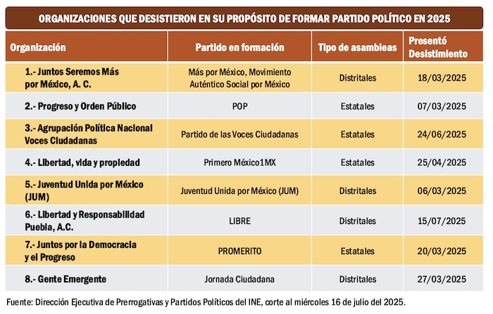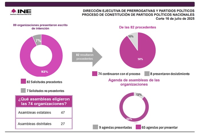 Han dado señales de vida sólo nueve de las 82 organizaciones que fueron autorizadas por el Instituto Nacional Electoral, en enero pasado, para realizar, indistintamente, 200 asambleas distritales o 20 asambleas estatales, como requisito previo para tener derecho a solicitar su registro como partido político nacional en enero del 2026. De igual manera, ocho de esas organizaciones ya manifestaron al INE su desistimiento para retirarse de la contienda.