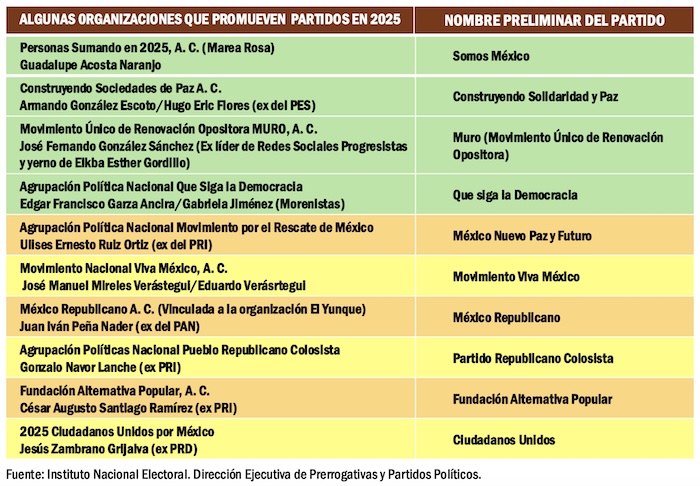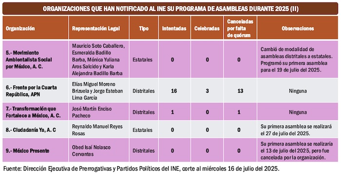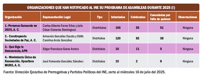 Sólo nueve organizaciones han mostrado alguna actividad: Personas Sumando en 2025, Construyendo Sociedades de Paz, Que Siga la Democracia, Movimiento Único de Renovación Opositora, Movimiento Ambientalista Social por México, Frente por la Cuarta República, Transformación que fortalece a México, Ciudadanía Ya y México Presente.