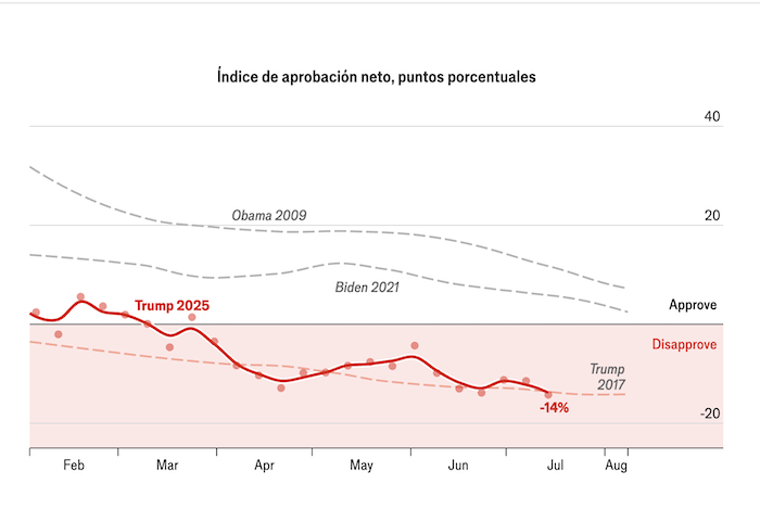 La encuesta de The Economist/ YouGov apunta a su vez que Trump pasó casi todo su primer mandato con una puntuación negativa y ahora su segunda administración parece estar siguiendo una trayectoria similar. “Su índice de aprobación tardó menos de dos meses en caer por debajo de cero, antes de desplomarse en respuesta a su ruinoso anuncio arancelario en abril. Las protestas por la inmigración parecen haber revertido una recuperación incipiente. Se ha mantenido estable con una aprobación neta por debajo de -10 durante varias semanas”.