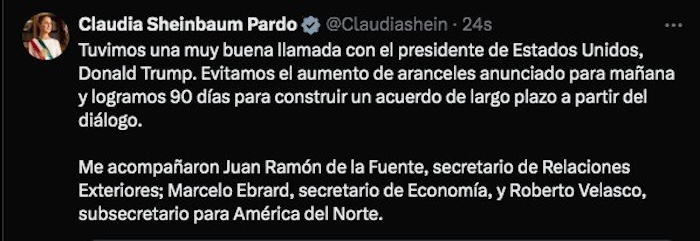 Ciudad de México, 2 de agosto (SinEmbargo).– El 3 de febrero de 2025, Claudia Sheinbaum Pardo entró en el Salón de Tesorería con una sonrisa clara, pero, muy a su estilo, moderada. “¿Ya vieron el tuit, no?”, preguntó a la prensa, lo cual dio paso a un estruendo de aplausos. La Presidenta había logrado contener primera amenaza arancelaria de Donald Trump en una conversación telefónica en la que se pactó la instalación de mesas de diálogo de alto nivel en migración, seguridad y comercio, mismas que se mantienen a la fecha y con las cuales este jueves 31 de julio logró una nueva pausa para la imposición de aranceles que iba a entrar en vigor este viernes.
