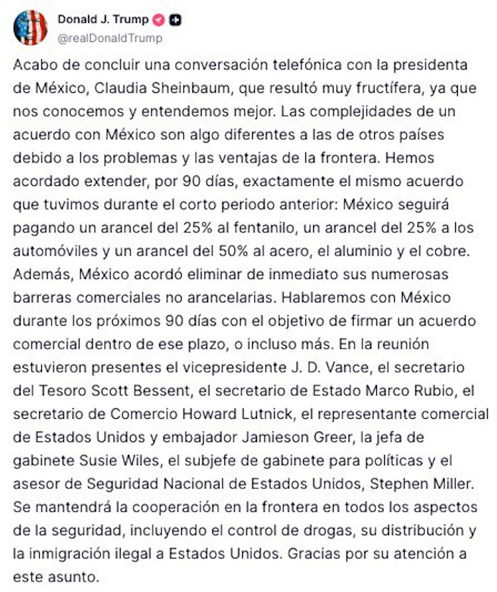 Por ejemplo, mientras Trump anunció que extendería el plazo para que México y Estados Unidos alcancen un acuerdo comercial, tras una conversación "muy fructífera" con Claudia Sheinbaum, horas antes afirmó que sería "muy difícil" alcanzar un acuerdo comercial con Canadá después de que Mark Carney, el primer ministro, afirmara que Canadá reconocería un Estado palestino en septiembre.