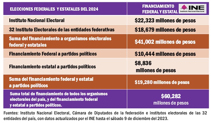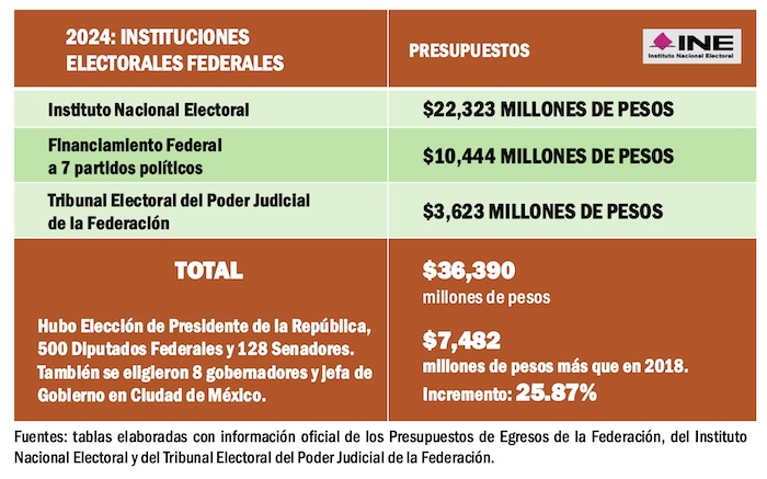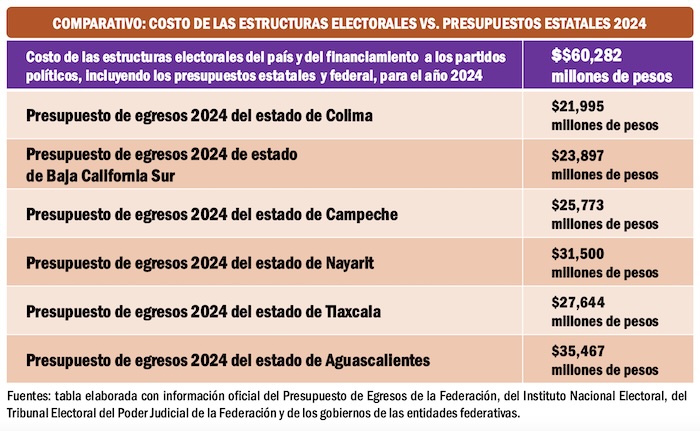 Si hacemos la suma del total de financiamiento federal y estatal a los organismos electorales y a los partidos políticos durante 2024 llegaríamos a la impresionante suma de 60 mil 282 millones de pesos. Ese presupuesto representó más que todo el gasto anual de varias entidades del país, que en ese mismo año tuvieron egresos menores, como fueron los casos de Colima, Baja California Sur, Campeche, Nayarit, Tlaxcala y Aguascalientes.