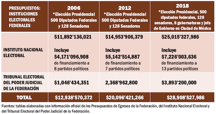 Los procesos electorales en México son cada día más caros. De los 11 mil millones de pesos que costaron los comicios presidenciales del 2006, el financiamiento llegó a los 36 mil millones de pesos en las elecciones presidenciales del 2024. Pero en los años intermedios hubo gastos exageradamente altos, como los del subsidio de la estructura electoral en 2021, que superó los 30 mil millones de pesos.