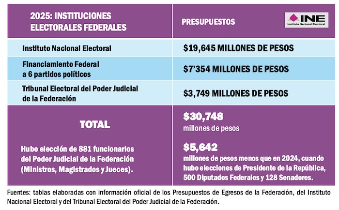 Para 2025 la reducción en el gasto electoral fue apenas menor en 5 mil millones de pesos, pero aún así rebasará la fabulosa cantidad de 30 mil millones de pesos.