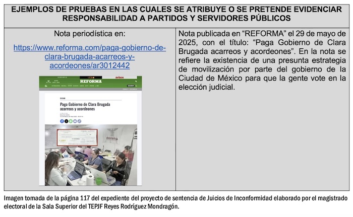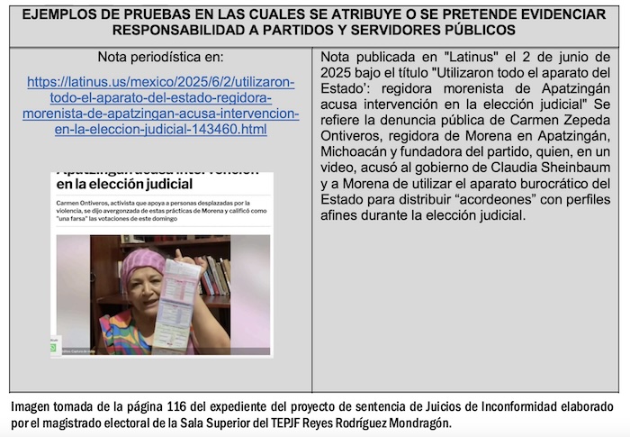 Explica el proyecto de sentencia de Rodríguez Mondragón que “la autoridad deberá considerar la totalidad del acervo probatorio incorporado al presente expediente, incluyendo los 361 registros documentales, los 45 procedimientos especiales sancionadores, las certificaciones de sitios web especializados, los testimonios audiográficos y la evidencia física de acordeones con características profesionales que exceden las capacidades de autofinanciamiento contempladas en el diseño de la elección judicial extraordinaria”.