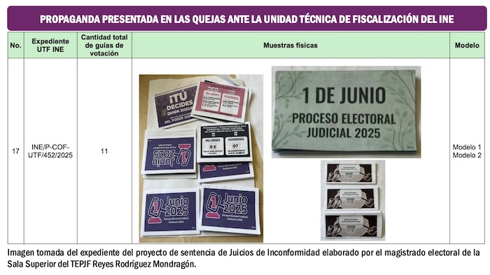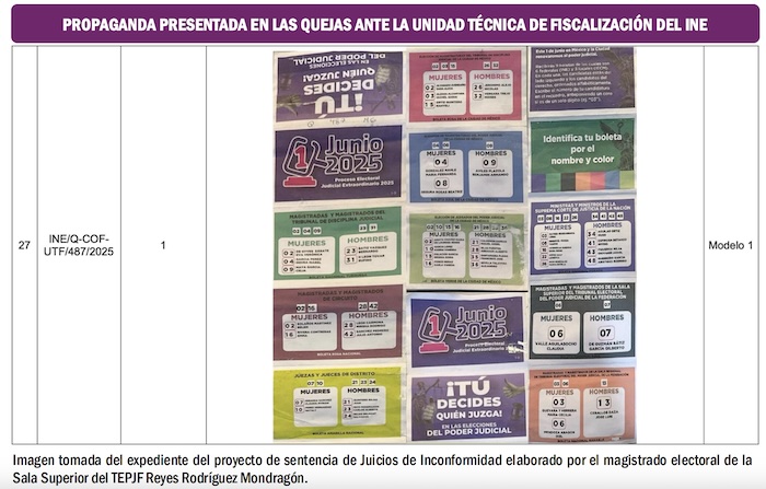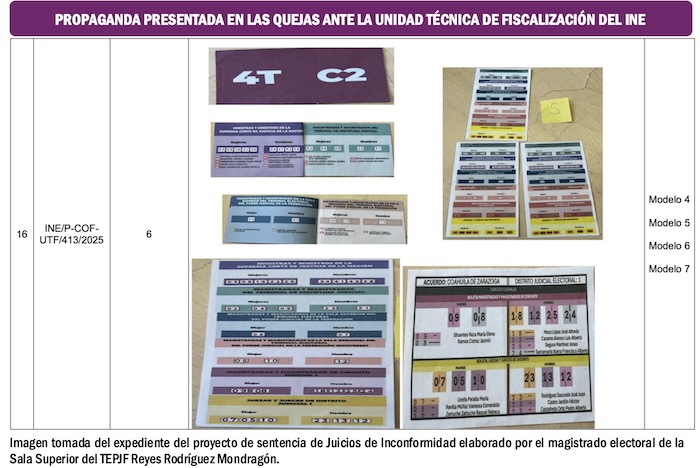 Un singularidad del proyecto de sentencia es que propone en el Punto 736 de las ponderaciones, publicado en la página 268 del documento, que se instruya a la Unidad Técnica de lo Contencioso Electoral del Instituto Nacional Electoral para que, en el ámbito de sus respectivas competencias, investiguen los hechos y conductas que se desprenden del expediente, relacionados con la probable participación de servidores públicos, el uso indebido de recursos públicos y la intervención de partidos políticos en la elaboración, distribución y circulación de los denominados ‘acordeones’ durante el Proceso Electoral Extraordinario del Poder Judicial de la Federación 2024-2025.